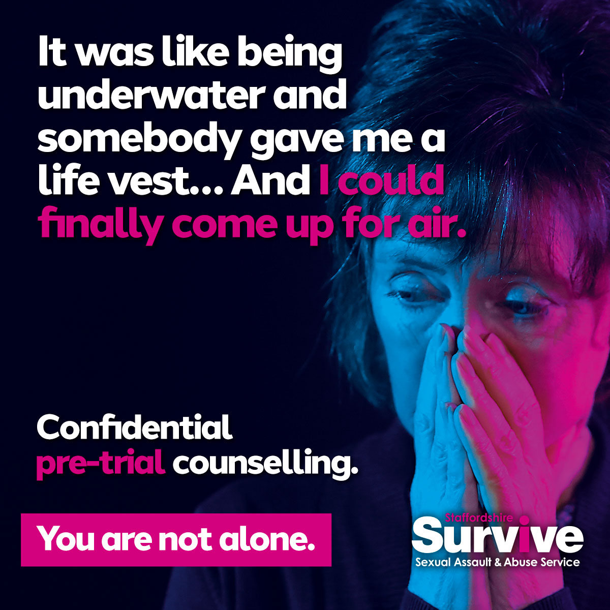 ‘Survive’, run by Staffordshire Women’s Aid, provides a free, non-judgemental and confidential therapy service for those affected by sexual assault and abuse.